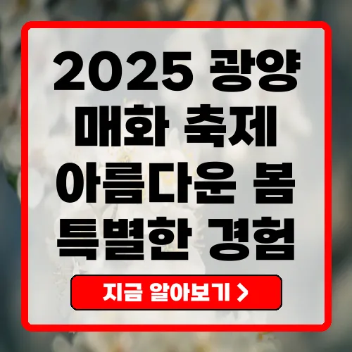 2025년 봄이 오기 전, 여러분은 어떤 계획을 세우고 계신가요? 따뜻한 햇살과 함께 반가운 봄이 찾아오면, 특히 매화꽃의 향기가 그리워질 겁니다. 광양 매화 축제는 매화의 아름다움과 함께하는 특별한 경험을 제공하는 대표적인 봄 이벤트입니다. 매년 많은 사람들에게 사랑받는 이 축제는 2025년 3월 7일부터 3월 16일까지 진행되며, 다압면 매화마을에서 축제를 즐길 수 있습니다. 축제 기간 동안 다양한 프로그램과 문화 행사, 체험 활동이 준비되어 있어 나와 가족, 친구들을 위한 완벽한 봄의 추억을 만들 수 있는 기회입니다. 자, 이제 광양 매화 축제의 다양한 매력과 정보를 깊이 있게 살펴보도록 하겠습니다. 매화꽃과 함께하는 즐거운 봄 여행을 계획하는 데 도움이 되는 유익한 정보들로 가득한 이 글에 함께하시죠!